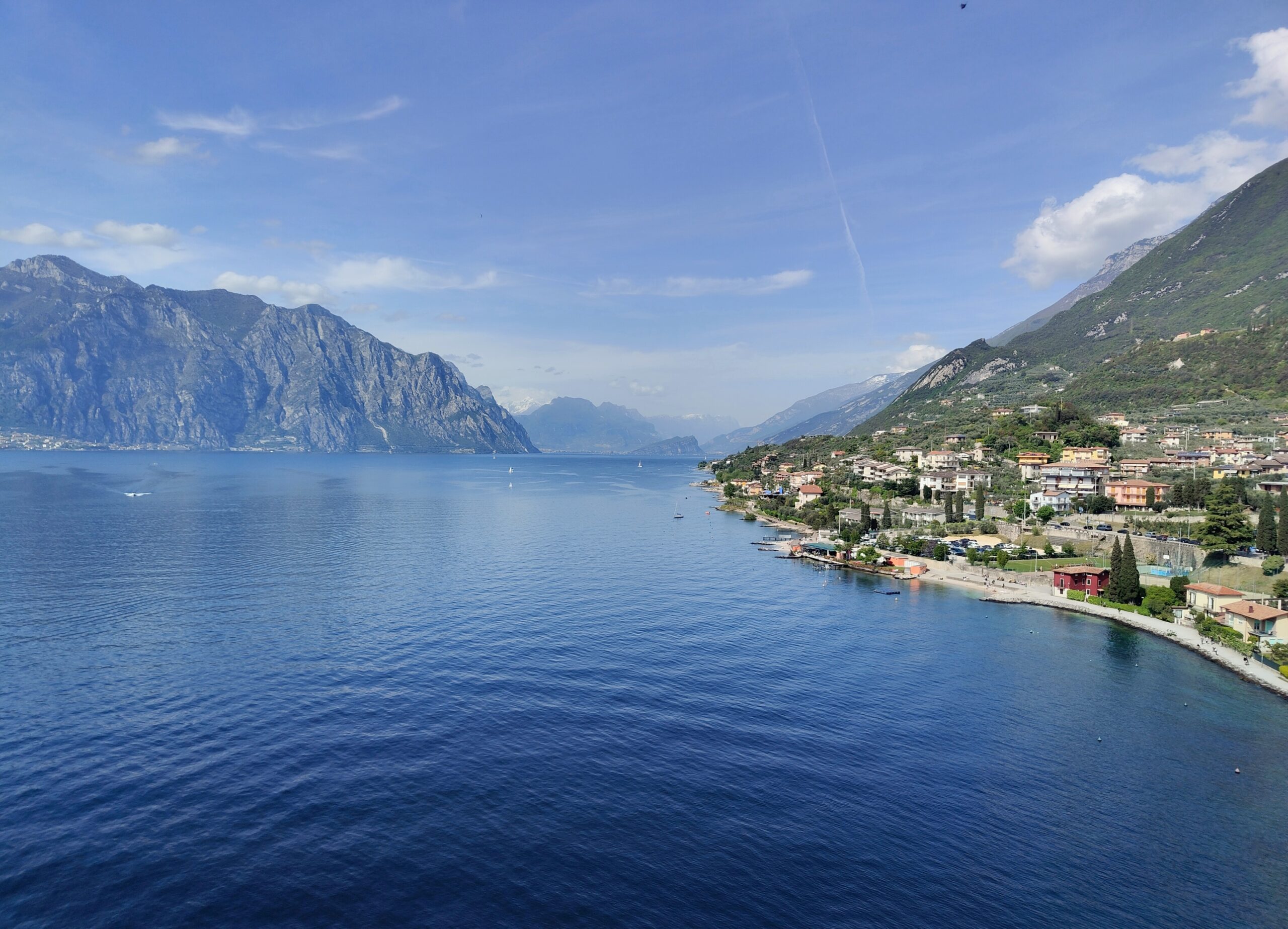 On one side, Malcesine is nestled at the foot of Monte Baldo and opposite shore of lake is also mountainous, is cleary visible. The views are really stunning.